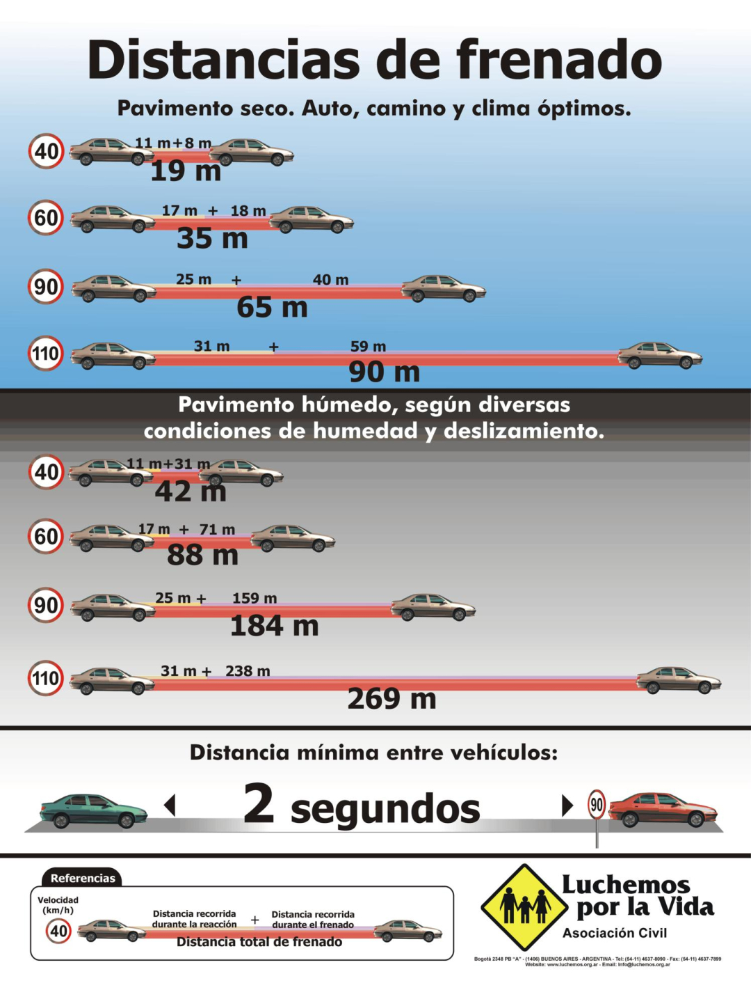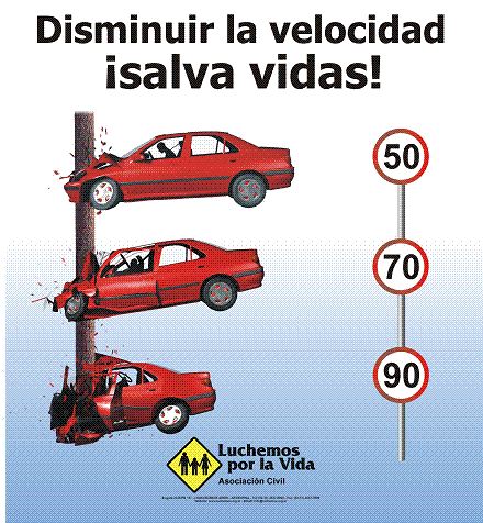 | Es necesario adecuarla a las circunstancias del camino, a las condiciones horarias y climáticas, por ejemplo, durante la noche, cuando llueve, cuando hay niebla, polvo, nieve, etc. Bajar la velocidad aumenta el margen para maniobrar. Y cuando la ansiedad por llegar pronto, el cansancio, o el sentirte muy seguro y hábil al volante te tienten a apretar el acelerador… pensá en los muchos apurados que nunca llegaron. |