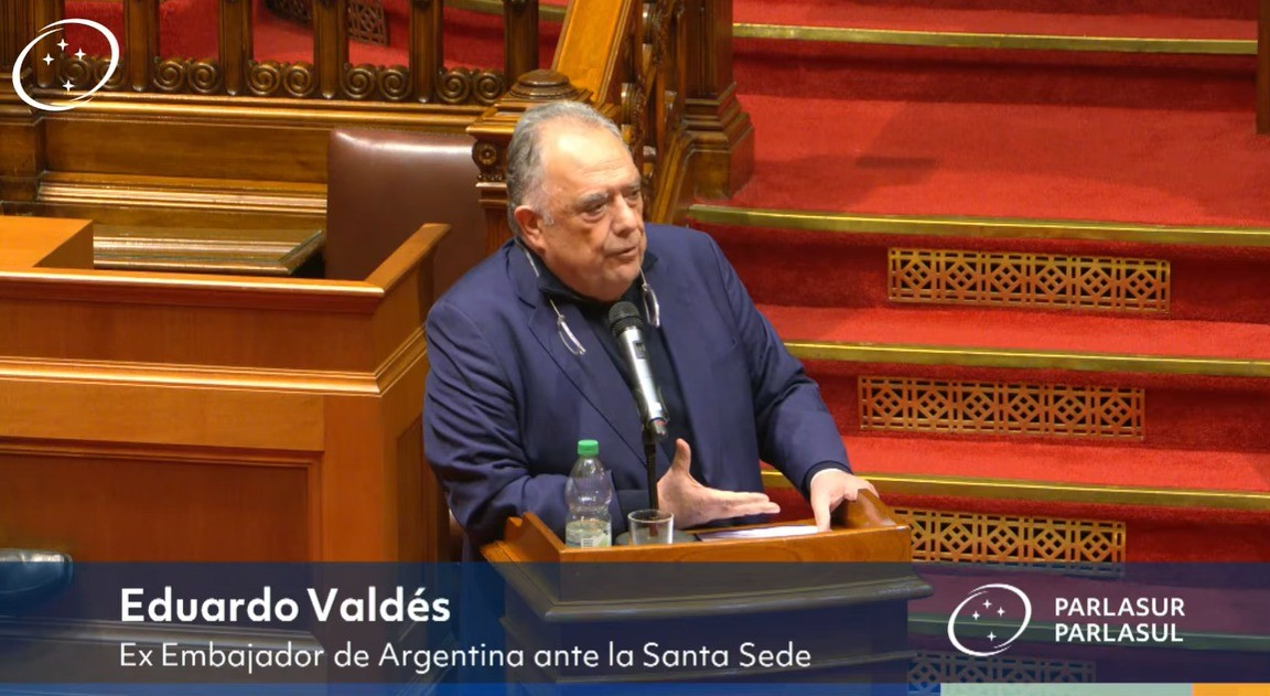 El presidente del Parlasur, el paraguayo Rodrigo Gamarra inauguró la sesión que tuvo entre sus invitados al presidente de la Comisión MERCOSUR de la Cámara de diputados de Argentina, Eduardo Valdés, quien dejó en su discurso un pedido por la paz: «Francisco tiene que ser el mensajero de la paz de cada dirigente político de América Latina porque ese es el mejor mensaje que podemos hacer en un mundo que esta en guerra. El MERCOSUR tiene que ser siempre una tierra de Paz» el diputado nacional, destacó la vocación pacífica de la juventud: «El sábado, mientras Milei desde el muro de los lamentos en Israel, nos decía que la Argentina estaba a favor de guerra, miles de jóvenes en Plaza de Mayo cantaban ‘Solo le pido a Dios, que la guerra no me sea indiferente’, ese es Francisco puro y está en Buenos Aires».